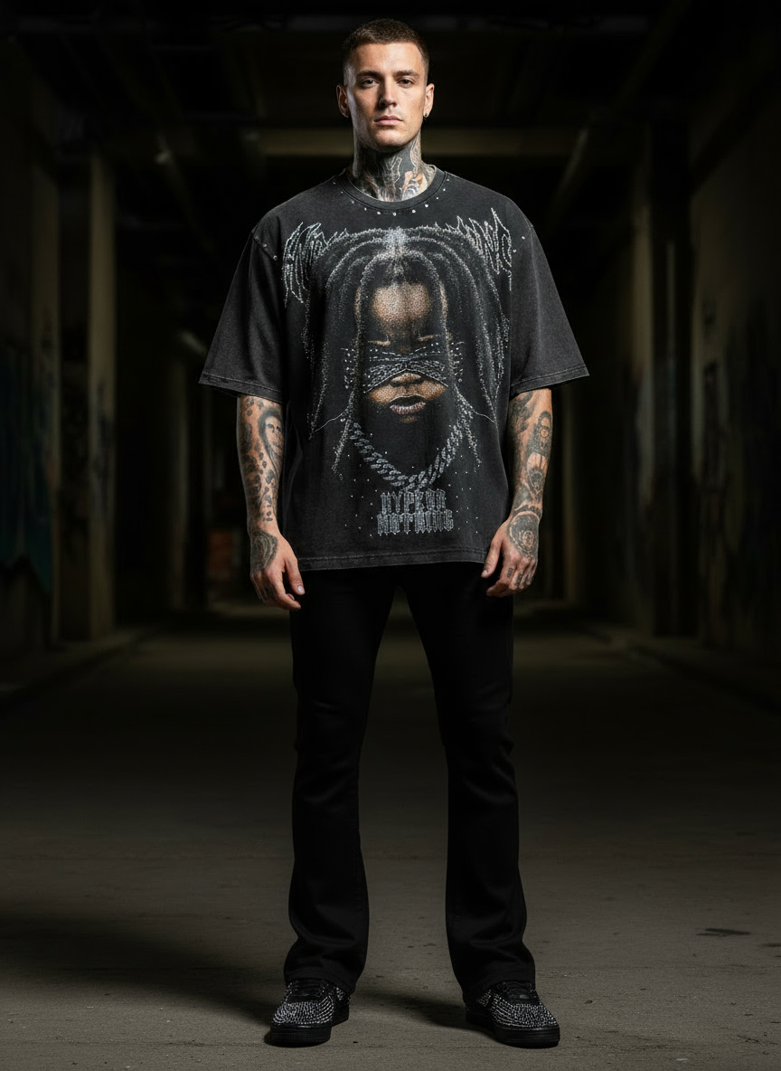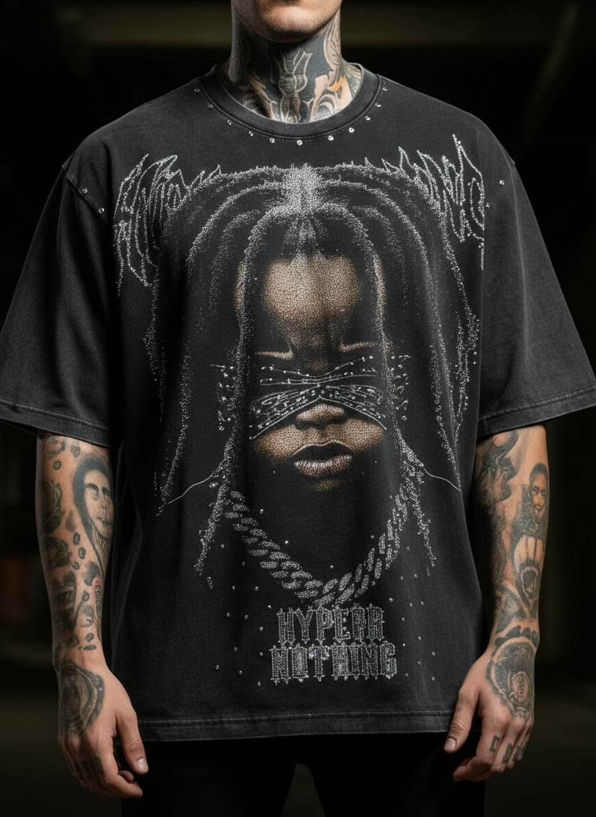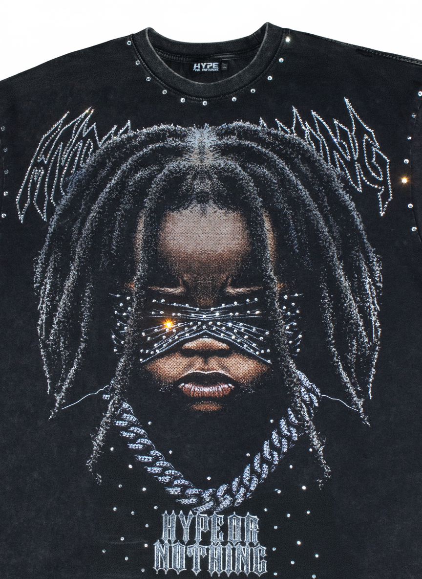 Inscription HYPE OR NOTHING en strass en bas du torse.